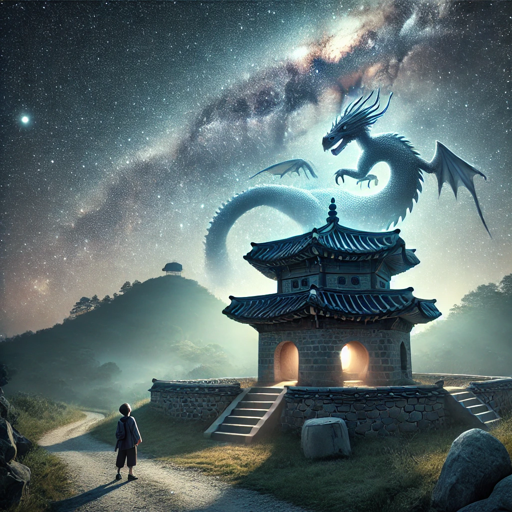 용은 유유히 첨성대 꼭대기에 앉더니, 신비로운 목소리로 소년에게 속삭였습니다.