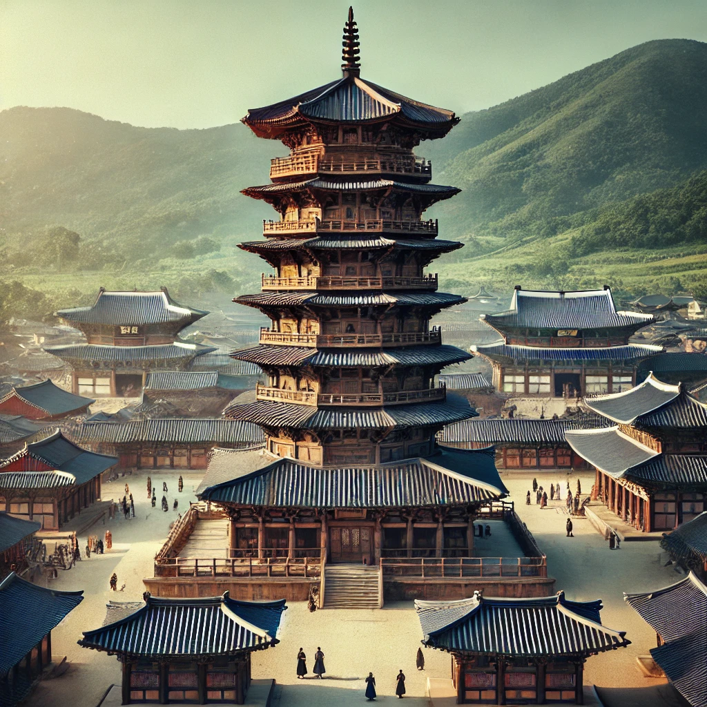 황룡사 9층 목탑은 경주 황룡사 내에 세워진 거대한 불탑으로, 신라 선덕여왕 때(645년) 완성되었습니다. 높이 약 80m로, 삼국시대 기록과 일본의 고대 사찰인 호류지(法隆寺)의 탑보다도 2배 이상 컸습니다. 목조 건축물로서는 세계에서 가장 높은 구조였다고 알려져 있습니다.